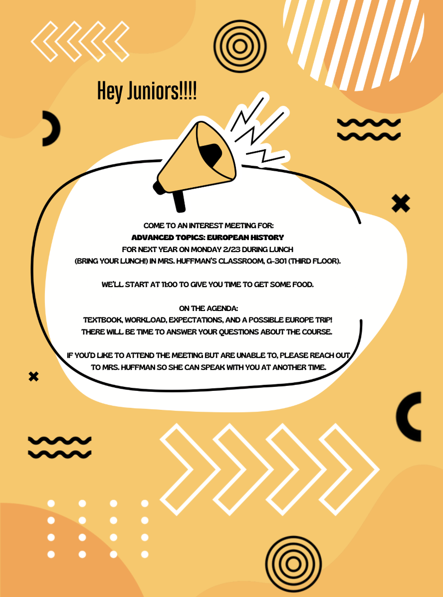 Students wishing to serve on next year’s Honor Council should reach out and speak with either Mrs. Lineberger or Dean Booker and submit a speech by Wednesday, Feb 25, no later than 3pm.
