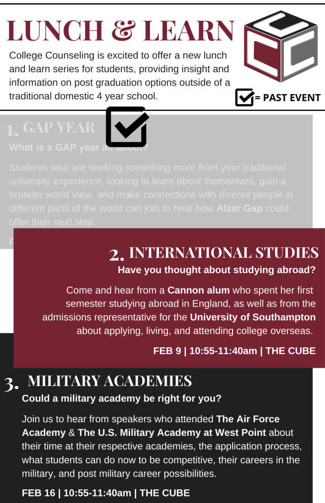 The College Counseling Team is excited to offer a new lunch and learn series for students, providing insight and information on post-graduation options outside of a traditional domestic 4-year school. Please note events are open to specific grade levels (listed below) and RSVP is required.