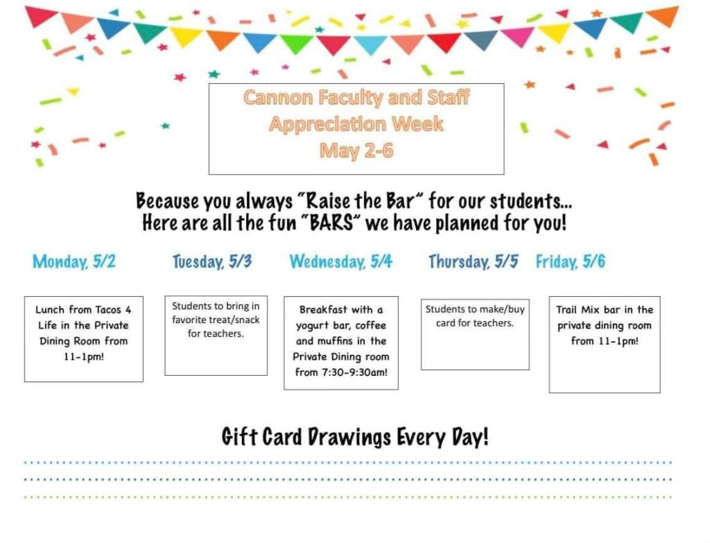 This week, Cannon Connections will be celebrating our teachers and staff. Below you will find an outline of the activities planned for the week to show our teachers how much they are loved and appreciated. Students and families are encouraged to shower the teachers with gratitude by participating on Tuesday and Thursday.