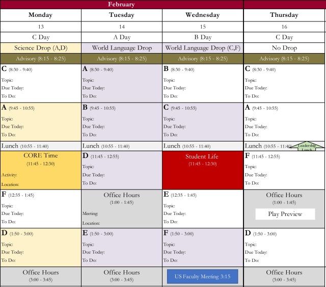 - Wednesday, March 8th: Election Day (speeches are delivered during Community Meeting)