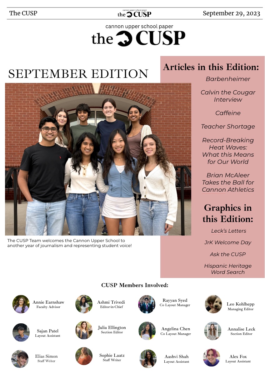 In this edition of the CUSP, take a deep dive into the Cannon community through an interview with Calvin the Cougar, updates on Cannon School’s new athletic director, Ask the CUSP, and solutions to the teacher shortage. If current events are more your style, learn about the implications of health policy issues pertaining to high-caffeine energy drink legislation, climate change, heat waves, and an all-time favorite summer of Barbenheimer. Be sure to try out the word search and our crossword puzzle to commemorate Hispanic Heritage Month!