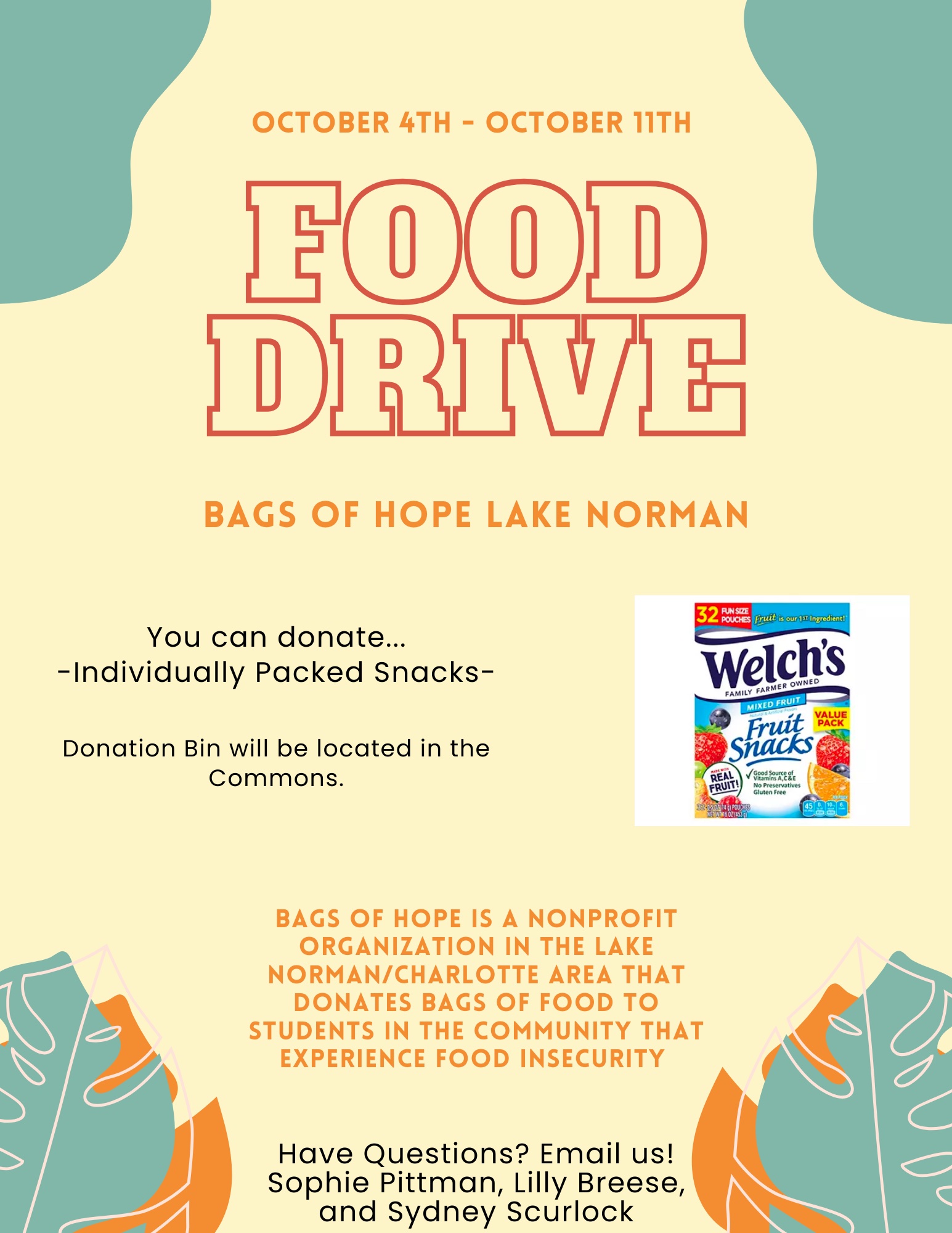 Sophie, Lilly, and Sydney are hosting a food drive for Bags of Hope Lake Norman for their AT: Lang deliverable for their Memorable Memoir Project. This food drive is aiding in combating food insecurity, which was an issue for the main character in the memoir, The Glass Castle.