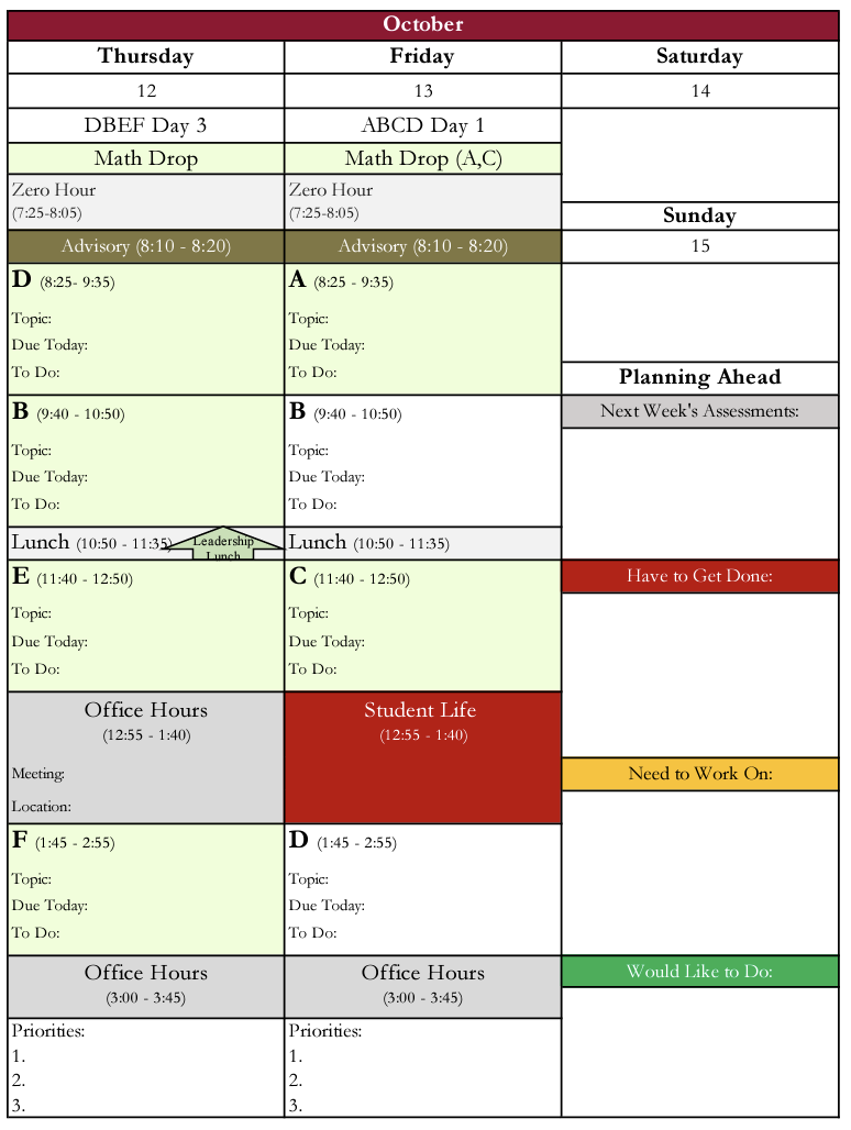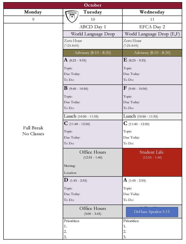 Class schedule for the week: