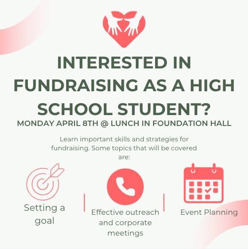 On Monday, April 8th, during lunch, I will be presenting on how to run a fundraiser as a high school student in Foundation Hall. I will discuss the types of fundraisers, effective fundraising methods, reaching out to corporations, and planning large and small events.