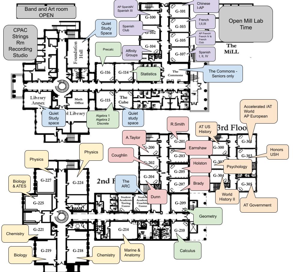 Today is our first OFFICE HOURS from 12:55- 1:40. Please use the map below to decide what classroom or study space you should go to and get some help or just get some work done. ALL students must be in a designated space- no roaming the halls or sitting in the hallways. ONLY Seniors in the Commons. This is not a time to be in Advisory- your Advisors need to be available to their students. If you have any questions or are confused, please ask your Advisor or your Grade-Level Dean. Let’s use our time wisely!