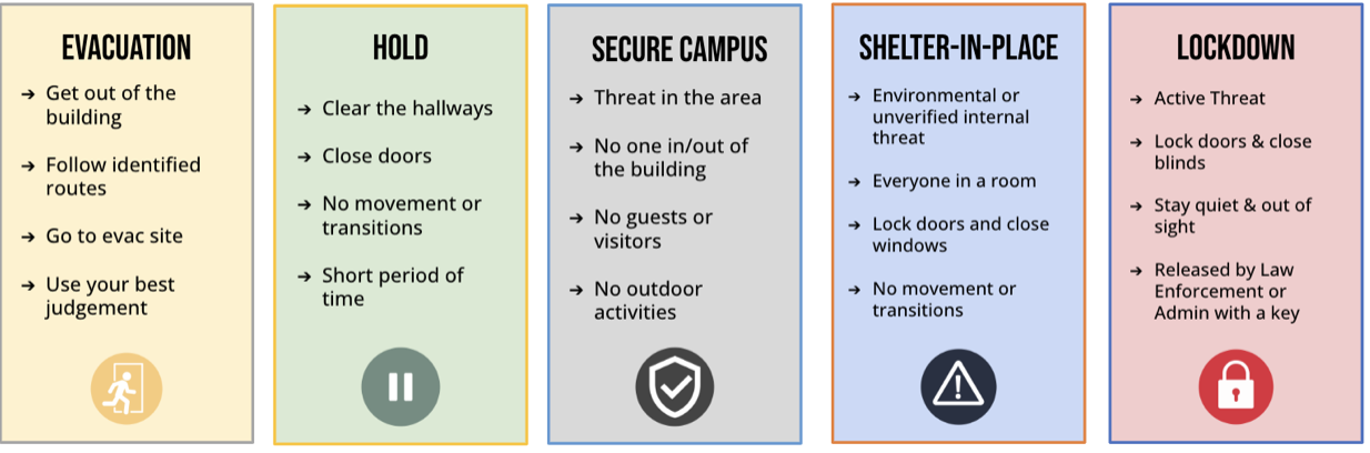 Thank you all for your attention at our Community Meeting this week as Mr. Hurtado spoke to us about our safety and security procedures. Please review the graphic below as a reminder of what was shared. See your Advisor, your grade-level Dean, Officer Reeves, Officer Leak, or another trusted adult on campus if you have questions!