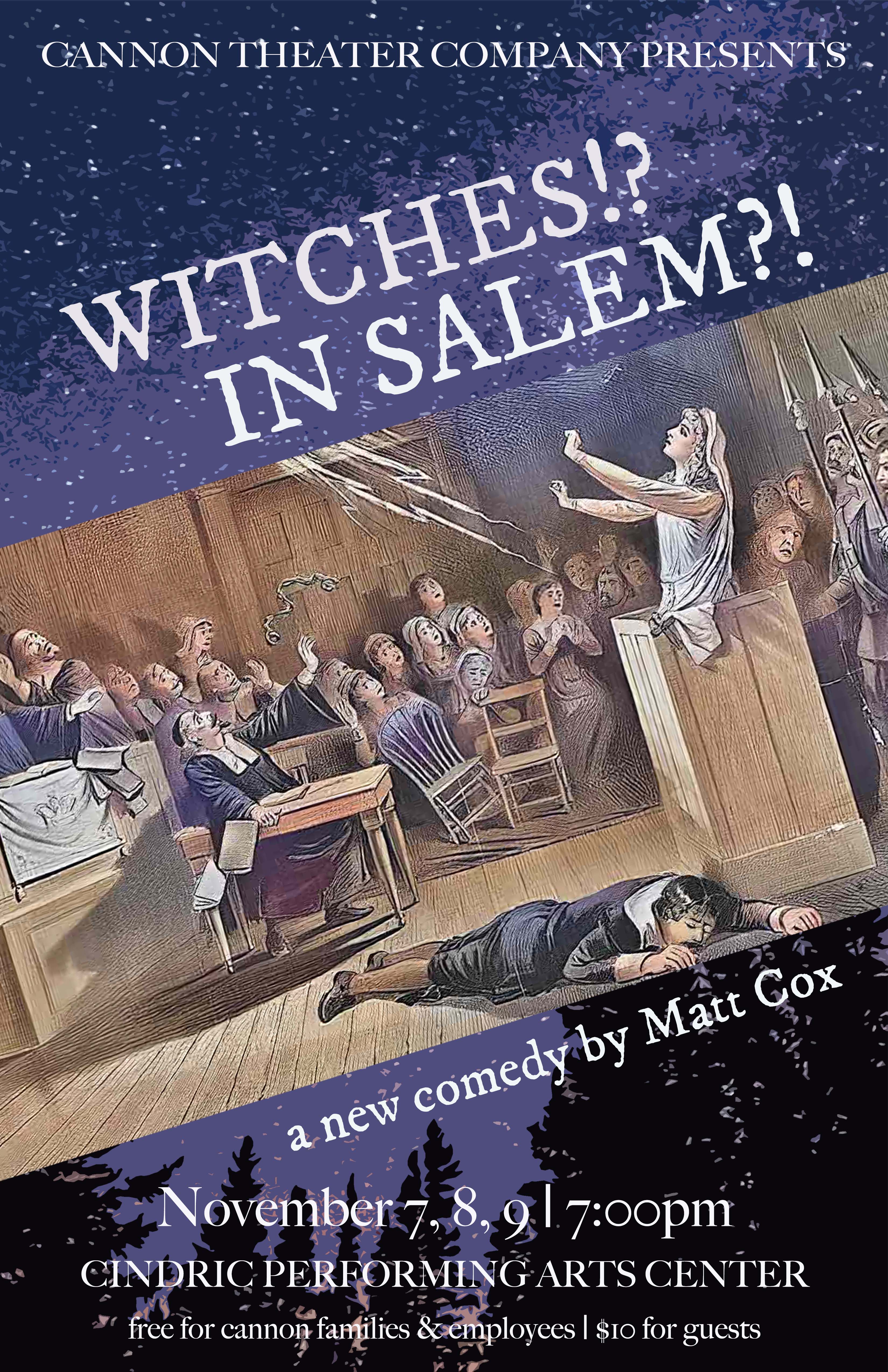 This Thurs-Sat November 7-9 at 7:00 pm, Cannon Theater Company will present “Witches!? In Salem?!”, the newest comedy from the playwright who created the runaway hit play “Puffs” (performed at Cannon two years ago.)