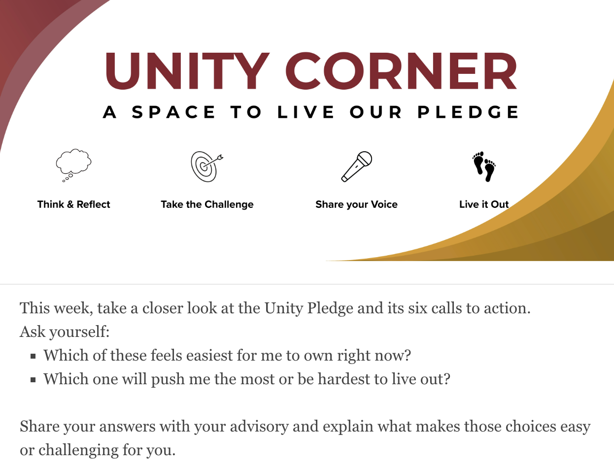 All Upper School students should arrive at the CPAC by 12:35 (our Student Life block) to hear from our guest speakers, learn more about the Unity Pledge, complete our Unity Walk, and sign the Unity Pledge.